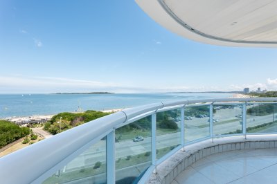 Unidad esquinera hacia Punta del Este, con vistas 180 grados partiendo desde Hotel ENJOY (Ex CONRAD) hasta Punta Ballena. Espectacular de dia por el mar azul y la iconica puesta del sol y de noche por la vista a la ciudad iluminada. Esta unidad en más de 180 m2 totales conecta vista-espacio de forma única, dado que inclusive desde sus dormitorios también podemos ver la Península. En total son 3 Dormitorios en suite + Toilette + cocina comedor con lavadero y dependencia en suite. Todos sus dormitorios con placares empotrados.