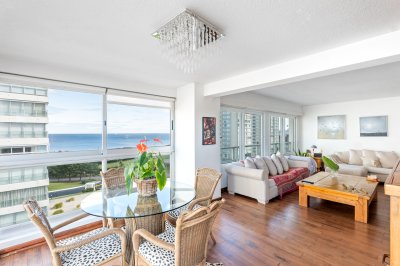 Espectacular departamento esquinero ubicado en la Torre Jefferson del Complejo Lincoln Center, unidad totalmente reciclada de 140 m2 totales compuestos por un amplio living-comedor en forma de L con balcón integrado desde donde se puede disfrutar de una muy buena vista al mar y puesta del sol, cuenta con tres dormitorios y dos baños (uno en suite), cocina definida con comedor diario y lavadero, y dependencia de servicio con baño. El departamento fue reciclado, cerramiento en DVH en living, piso flotante en toda la unidad (excepto cocina), baños full nuevos, eléctrica, aires, y un muy buen equipamiento.