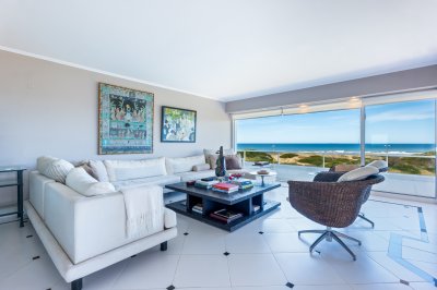 Departamento pent house duplex ubicado en el edificio Aguas Azules en primera linea Playa Brava. La unidad cuenta con un amplio living-comedor con estufa a leña con vistas al océano, cuatro dormitorios (tres en suite), toilette y cocina definida con entrada independiente. En su segundo nivel dispone de una gran barbacoa, amplias terrazas con vista al mar y jacuzzi y un dormitorio con office, vestidor walk-in y doble baño. Como si fuera poco, en planta baja cuenta con un loft completo con baño y cocina para huéspedes.