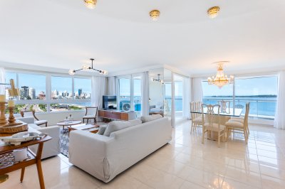 Unidad esquinera hacia Punta del Este, con vistas 180 grados partiendo desde Hotel ENJOY (Ex CONRAD) hasta Punta Ballena. Espectacular de dia por el mar azul y la iconica puesta del sol y de noche por la vista a la ciudad iluminada. Esta unidad en más de 180 m2 totales conecta vista-espacio de forma única, dado que inclusive desde sus dormitorios también podemos ver la Península. En total son 3 Dormitorios en suite + Toilette + cocina comedor con lavadero y dependencia en suite. Todos sus dormitorios con placares empotrados.