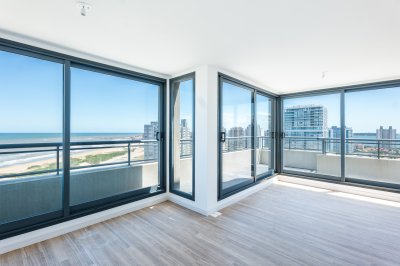 Piso alto a estrenar de 94m2 totales en el recién terminado y moderno edificio Siglo Sol II. Amplio living-comedor con cocina integrada con barra, balcón enpo forma de L que rodea todo el living con espectaculares vistas 180° grados de la playa brava a la mansa. Dos dormitorios definidos, dos baños (1 en suite). El dormitorio principal tiene balcón propio con vista al mar. Placares empotrados en los dormitorios, baños con artefactos de calidad, cerramiento en DVH en aluminio galvanizado negro. Ideal para inversión dada sus expensas, cantidad de amenities, ubicación y posibilidades de renta.
