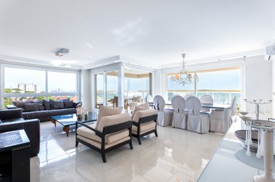 En el gran edificio LE JARDIN presentamos esta unidad esquinera a Punta del Este con 151 m2 internos y 180 m2 totales, distribuida en tres comodos dormitorios en suites, principal con orientado hacia el mar con vista a la Isla Gorriti, toilette, y cocina definida con lavadero y dependencia de servicio con baño. Amplio living-comedor orientado a la Península, con salida a una terraza en forma de L que ofrece grandes vistas a la bahia. La unidad cuenta con un garage.