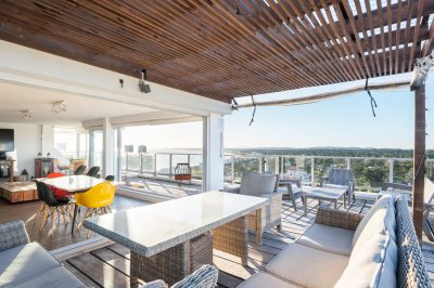 Presentamos este magnifico departamento ubicado en la Torre Wilson del Complejo Lincoln Center, unidad de 220 m2 totales y 174 m2 internos, distribuidos en dos pisos orientado hacia el NorOeste con una vista única a la mansa y Punta Ballena. En planta baja nos encontramos con un amplio living-comedor con una cocina con barra, dos dormitorios, dos baños, y dependencia de servicio con baño. La planta alta es otro departamento más, muy bien distribuido y equipado, con un amplio living comedor una estufa a leña instalada, parrillero, toilette, dos dormitorios (uno en suite), y una amplia terraza en forma de L con grandes sillones desde donde podemos disfrutar de una hermosa vista al mar y al bosque. El departamento cuenta con mejoras realizadas como vidrios DVH, aires acondicionados, rollers automatizados, luminaria nueva, estufa en el segundo nivel, piso vinilico, deck y una pérgola con toldos en la terraza. La unidad cuenta con dos cocheras, una techada y un garage en subsuelo.